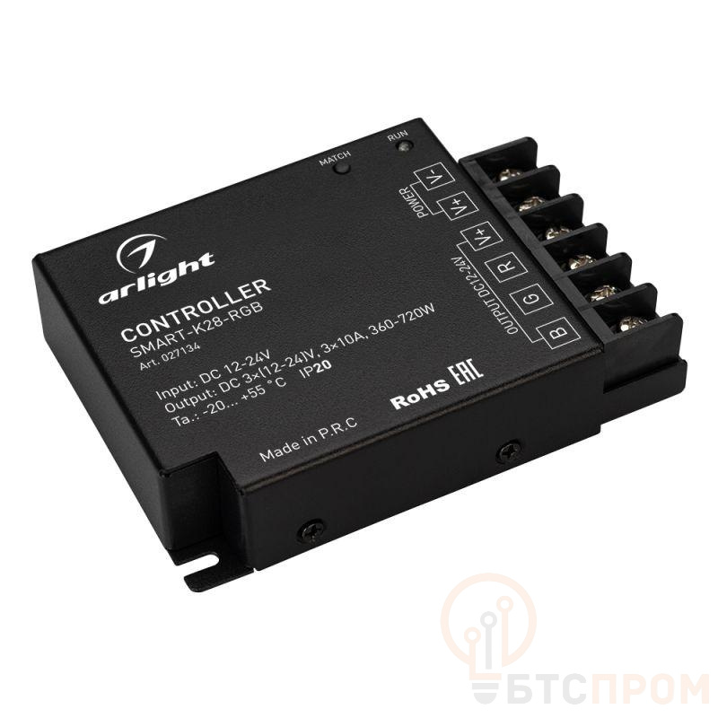 Контроллер для светодиодной RGB ленты (ШИМ). Питание/рабочее напряжение 12-24VDC, максимальный ток 10A на канал, 3 канала, максимальная мощность 360-720W. Винтовые клеммы. Корпус - PVC. Габариты 110x75x25 мм. Управляется пультами и панелями серии SMART (поставляются отдельно).