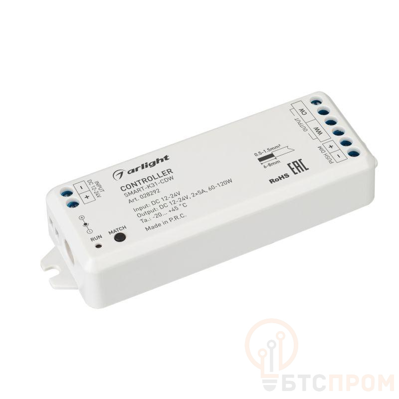 Контроллер для светодиодной биполярной CDW ленты (2 провода). Питание/рабочее напряжение 12-24VDC, максимальный ток 5A на канал, 2 канала, максимальная мощность 60-120W на канал. Винтовые клеммы. Корпус - PVC. Габариты 114x38x20 мм. Контроллер работает только с биполярными лентами, в том числе, лентами CDW. Управляется пультами и панелями серии SMART (поставляются отдельно).