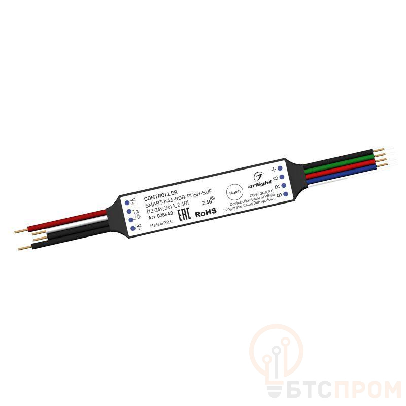 Миниатюрный контроллер для RGB светодиодной ленты (ШИМ). Питание/рабочее напряжение 12-24VDC, максимальный ток 1A на канал, 3 канала, максимальная мощность 36-72W. Поддерживает функцию Push-Dim. Габариты 60x14x6 мм. Совместим с пультами и панелями SMART, поддерживающими управление по радиоканалу. !!!Актуальная схема привязки пультов в инструкции на сайте!!!