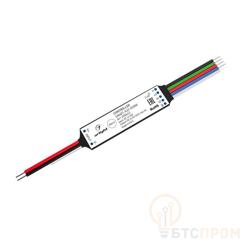 Миниатюрный контроллер для RGBW светодиодной ленты (ШИМ). Питание/рабочее напряжение 12-24VDC, максимальный ток 1A на канал, 4 канала, максимальная мощность 48-96W. Габариты 60x14x6 мм. Совместим с пультами и панелями SMART, поддерживающими управление по радиоканалу. !!!Актуальная схема привязки пультов в инструкции на сайте!!!