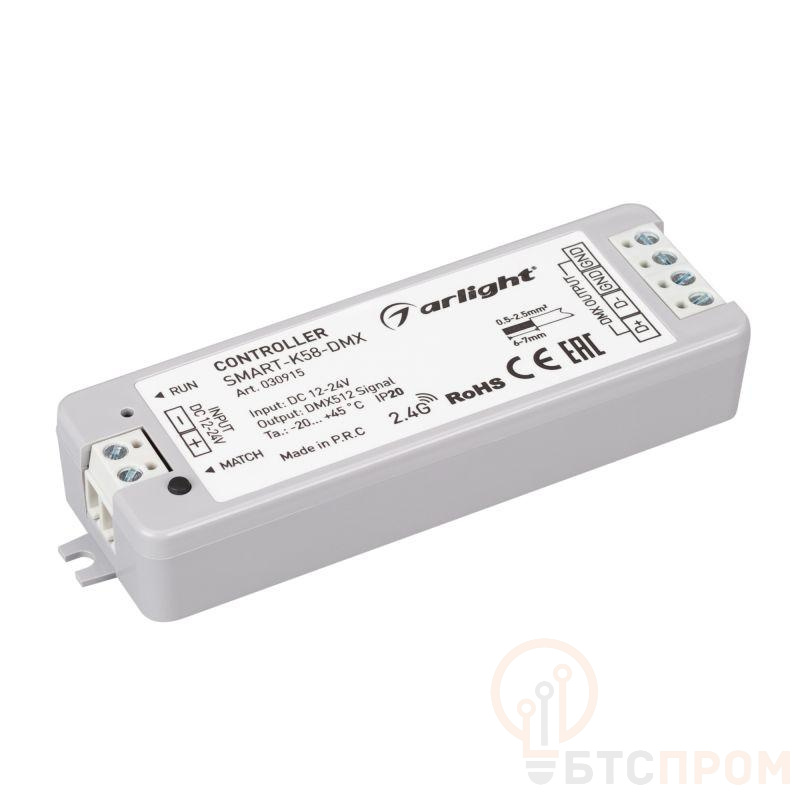 Миниатюрный DMX512 контроллер для управления DMX512 лентами и модулями. Питание DC5-24V, выход цифровой сигнал DMX512. Габариты 97х33х18 мм. Корпус - PVC. Управляется пультами и панелями серии SMART.