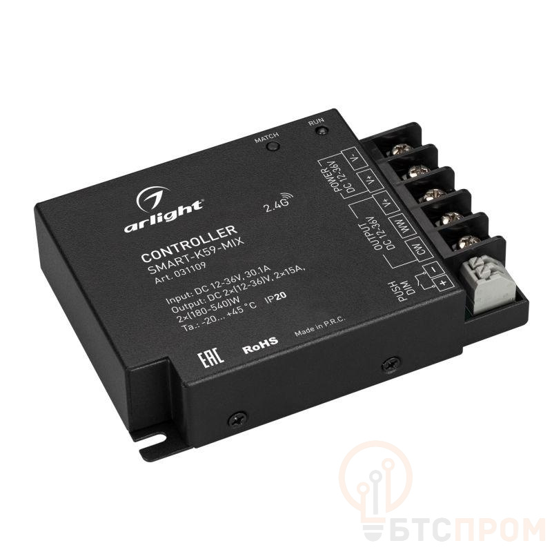Контроллер для светодиодной MIX ленты (ШИМ). Питание/рабочее напряжение 12-36VDC, максимальный ток 15A на канал, 2 канала, максимальная мощность 360-1080W. Винтовые клеммы. Корпус - металл. Габариты 107x75x24.5 мм. Управляется пультами и панелями серии SMART (поставляются отдельно).