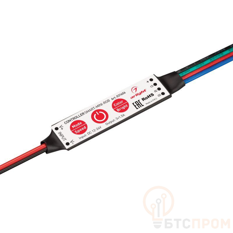 Миниатюрный контроллер для мультицветной (RGB) светодиодной ленты (ШИМ). Питание/рабочее напряжение 12-24VDC, максимальный ток 1.5A на канал, 3 канала, максимальная мощность 54-108W. Габариты 60x12.5x5 мм. Управление кнопками на корпусе диммера.