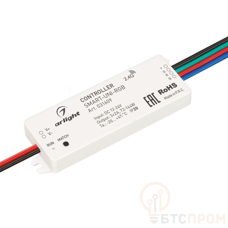 Контроллер для мультицветной (RGB) светодиодной ленты (ШИМ). Питание/рабочее напряжение 12-24VDC, максимальный ток 2A на канал, 3 канала, максимальная мощность 72-144W. Корпус - PVC. Габариты 76x23.5x8.7 мм. Управляется пультами и панелями серии SMART (поставляются отдельно). !!!Актуальная схема привязки пультов в инструкции на сайте!!!