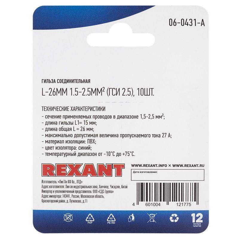Гильза соединительная изолированная СГИ L-26мм 1.5-2.5кв.мм ГСИ 2.5/ГСИ 1.5-2.5/BV2 син. (блист.10шт) Rexant 06-0431-A
