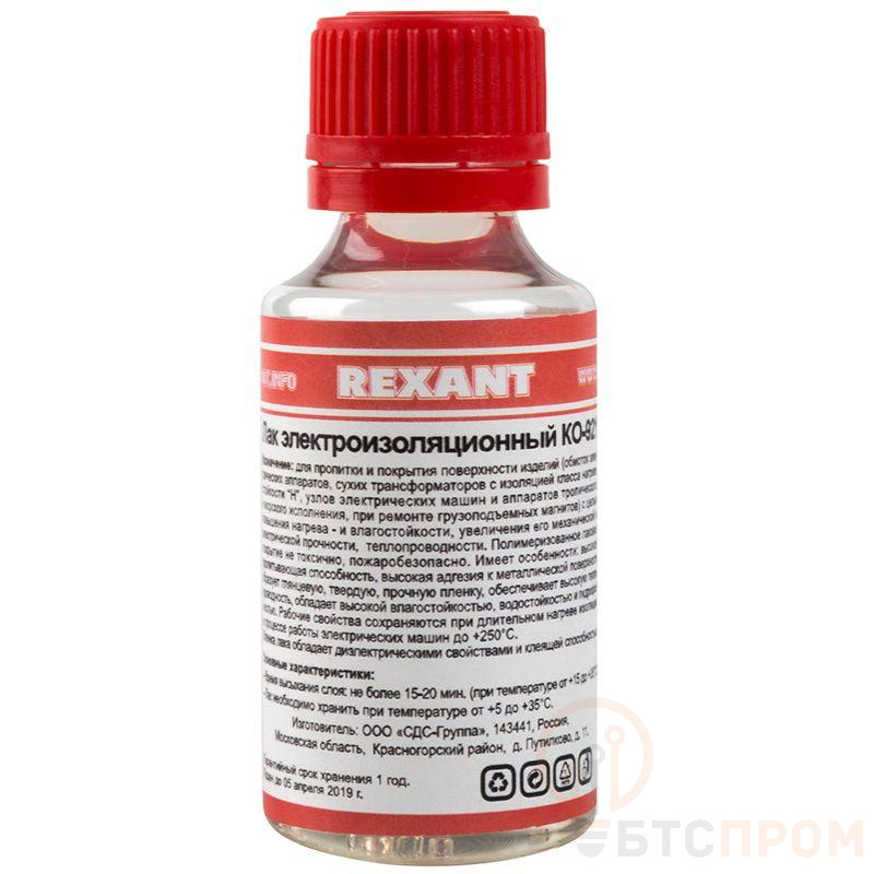 Лак электроизоляционный KO-921 30 мл REXANT предназначен для пропитки и покрытия поверхности изделий (обмоток электрических аппаратов, сухих трансформаторов с изоляцией класса нагревостойкости «Н», узлов электрических машин и аппаратов тропического и морского исполнения, при ремонте грузоподъемных магнитов), с целью повышения нагрево- и влагостойкости, увеличения его механической и электрической прочности и теплопроводности. Полимеризованное лаковое покрытие нетоксично, пожаробезопасно. Имеет особенности: Высокая пропитывающая способность, которая обусловлена минимальной вязкостью, малым поверхностным натяжением. Высокая адгезия к металлической поверхности. Образует глянцевую, твердую, прочную пленку. Обеспечивает высокую теплопроводность. Обладает высокой влагостойкостью, водостойкостью и гидрофобностью. Рабочие свойства сохраняются при длительном нагревании изоляции в процессе работы электрических машин до +250 ?С. Пленка лака обладает диэлектрическими свойствами. Обладает клеящей способностью. Основные характеристики: Время высыхания слоя: не более 15-20 мин (при температуре +15...+35 ?С) Лак необходимо хранить при температуре +5...+35 ? Фасовочная емкость: 30 мл