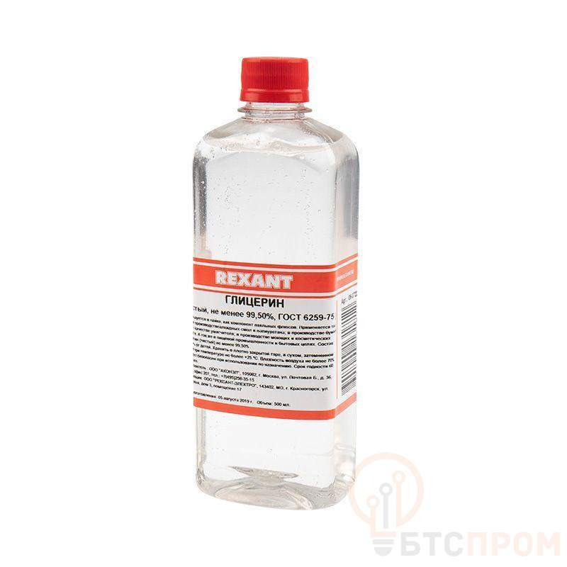 Глицерин 500 мл REXANT — бесцветная, вязкая и очень гигроскопичная жидкость. Смешивается с водой в любых пропорциях. Сладкая на вкус. Область применения: В производстве алкидных смол, полиуретана и акролеина. В табачном производстве в качестве увлажнителя табака. В бумажной и кожевенной отраслях промышленности в качестве умягчителя тканей, кожи и бумаги. В медицинской промышленности. В производстве моющих, косметических средств и парфюмерных препаратах, как регулятор влажности. В пищевой промышленности. В электротехнике и радиотехнике. Объем: 500 мл Нормы по ГОСТ 6259-75 Внешний вид: густая бесцветная прозрачная гигроскопическая жидкость. Плотность при 20 °С г/см3: 1,258-1,261 Массовая доля глицерина, не менее: 99,3 % Показатель преломления П20D: 1.4728-1.4744 Массовая доля остатка после прокалывания в виде сульфатов, не более: 0,001% Массовая доля сульфатов, не более: 0,0005 % Массовая доля хлоридов, не более: 0,0001 % Массовая доля аммонийных солей, не более: 0,0005 % Массовая доля железа, не более: 0,00005 % Массовая доля мышьяка, не более: 0,00004 % Массовая доля тяжелых металлов, не более: 0,00005 % Массовая доля эфиров жирных кислот и жирных кислот в пересчете на масляную кислоту, не более: 0,025 % Вещества, восстанавливающие серебро из аммиачного раствора: испытание. Вещества, темнеющие под действием серной кислоты: испытание. Сахароза и глюкоза: испытание. pH 10 % р-ра препарата: 6-7