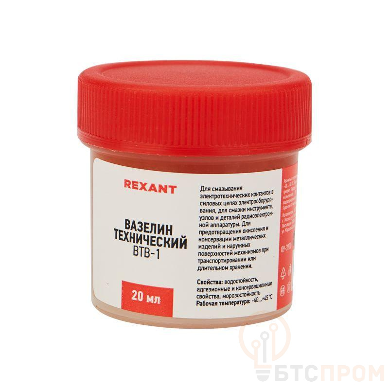 Вазелин технический ВТВ-1 20 г REXANT — консервационная смазка с высокими защитными свойствами; нефтяное масло, загущенное тугоплавкими углеводородами — парафином и церезином, содержит антикоррозионную и адгезионную присадки. Внешний вид — однородная мазь от светло-желтого до светло-коричневого цвета. Основные свойства: Высокая водостойкость Адгезионные и консервационные свойства Хорошая морозостойкость Диапазон рабочих температур –40...+45 °С Область применения: Область применения волокнистого технического вазелина обусловлена его смазывающими, защитными и консервационными свойствами, а также высокой диэлектрической способностью: - предотвращение окисления клемм аккумуляторов и наконечников проводов автомобилей; - консервация металлических изделий и наружных поверхностей механизмов при транспортировании и длительном хранении; - рекомендован для смазывания электрических контактов в силовых цепях электрооборудования; - применяется для смазки инструмента, узлов и деталей радиоэлектронной аппаратуры. Безопасность: Вазелин технический ВТВ-1 является малотоксичным продуктом и не требует использования особых средств индивидуальной защиты.