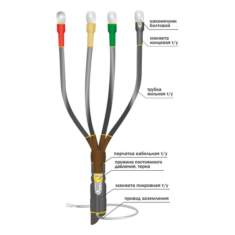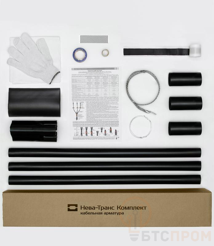 МУФТА КОНЦЕВАЯ ТЕРМОУСАЖИВАЕМАЯ МАРКИ 1КВТпнг-LS-3х(16-25) ВНУТРЕННЕЙ УСТАНОВКИ предназначена для оконцевания 3-х жильных силовых кабелей сечением 16, 25 кв.мм с бумажной или с пластмассовой изоляцией, с броней или без брони, на напряжение до 1 кВ включительно. Универсальна в применении. Удовлетворяет самым строгим требованиям пожарной безопасности. Детали, входящие в комплект кабельной муфты, изготовлены на основе материалов, не распространяющих горение (нг) с пониженным дымо- и газовыделением (LS). Устанавливается внутри помещений всех категорий влажности. Соответствует требованиям ГОСТ 13781.0-86 и ТУ Нева-Транс 3599-012-31930690-2016. Прошла необходимый комплекс независимых испытаний, на основании которых выданы сертификаты соответствия требованиям пожарной безопасности и Госстандарта России. Монтируется на разделке кабеля методом термоусаживания основных комплектующих с помощью горелки или высокотемпературного фена. Предусматривает крепление провода заземления к металлической оболочке кабеля, имеющего бумажную изоляцию, с помощью пружины постоянного давления и терки, а к бронелентам методом пайки. Сочетает в себе высокую эксплуатационную надежность и экологическую безопасность.