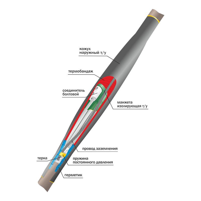 МУФТА СОЕДИНИТЕЛЬНАЯ ТЕРМОУСАЖИВАЕМАЯ МАРКИ 1ПСТб(тк)-5х(35-50) С СОЕДИНИТЕЛЯМИ БОЛТОВЫМИ предназначена для соединения 5-ти жильных силовых кабелей сечением 35, 50 кв.мм с пластмассовой изоляцией с броней на напряжение до 1 кВ включительно. Устанавливается непосредственно в грунте, а также в тоннелях, каналах, коллекторах и других кабельных сооружениях без ограничения по уровню прокладки. Эксплуатируется при температуре окружающей среды от -50град.С до +50град.С и относительной влажности до 98%. Соответствует требованиям ГОСТ 13781.0-86 и ТУ Нева-Транс 3599-012-31930690-2016. Прошла необходимый комплекс независимых испытаний, на основании которых выдан сертификат соответствия Госстандарта России. Монтируется на двух концах соединяемых кабелей методом термоусаживания основных деталей из модифицированного полимера, входящих в комплект муфты, с помощью горелки или высокотемпературного фена. Имеет наружный толстостенный термоусаживаемый кожух с нанесенным на него клеевым слоем, обеспечивающий полноценную защиту и герметичность кабельной муфты. Предусматривает крепление провода заземления к бронелентам кабеля с помощью пружин постоянного давления и терок. Сочетает в себе высокую эксплуатационную надежность и экологическую безопасность.