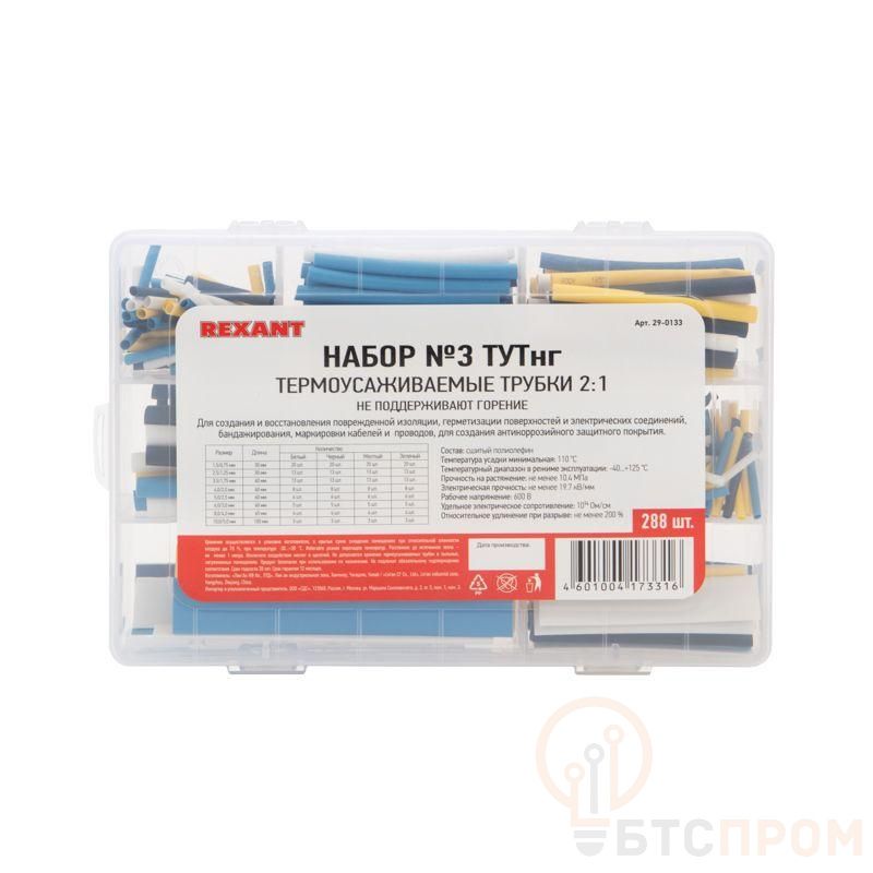 Набор № 3 состоит из термоусаживаемых трубок, предназначенных для восстановления и создания изоляции, герметизации поверхностей и электрических соединений кабелей, бандажирования и маркировки проводов, а также для создания антикоррозийных защитных покрытий. В результате нагрева трубки меняют свой диаметр, сжимаются и принимают форму предмета или материала, на который совершается усадка. Изделия, входящие в состав набора, выполнены из экологически безопасных материалов, не содержащих галогенов. Трубки не поддерживают горение: в отсутствие открытого огня затухают и не воспламеняются. Это обеспечивает дополнительную безопасность в случае возникновения пожара. Состав набора: 1,5/0,75 мм – 30 мм (белый 20 шт.; черный 20 шт.; желтый 20 шт.; синий 20 шт.) 2,5/1,25 мм – 30 мм (белый 13 шт.; черный 13 шт.; желтый 13 шт.; синий 13 шт.) 3,5/1,75 мм – 60 мм (белый 13 шт.; черный 13 шт.; желтый 13 шт.; синий 13 шт.) 4,0/2,0 мм – 60 мм (белый 8 шт.; черный 8 шт.; желтый 8 шт.; синий 8 шт.) 5,0/2,5 мм – 60 мм (белый 6 шт.; черный 6 шт.; желтый 6 шт.; синий 6 шт.) 6,0/3,0 мм – 60 мм (белый 5 шт.; черный 5 шт.; желтый 5 шт.; синий 5 шт.) 8,0/4,0 мм – 65 мм (белый 4 шт.; черный 4 шт.; желтый 4 шт.; синий 4 шт.) 10,0/5,0 мм – 100 мм (белый 3 шт.; черный 3 шт.; желтый 3 шт.; синий 3 шт.) Гарантийный срок эксплуатации – 7 лет. Гарантийный срок хранения – 7 лет. Рекомендуем проводить работы по усадке трубок с помощью специальных электромонтажных фенов и газовых горелок REXANT.