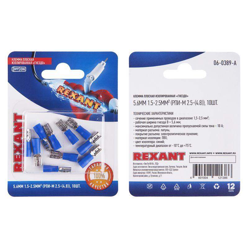 Клемма плоская изолированная (гнездо-5.6мм) 1.5-2.5кв.мм (РПи-м 2.5-(4.8) / РПИм 2-5-0.8 / FDD2-187(5)) (блист.10шт) Rexant 06-0389-A