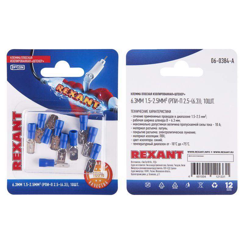 Клемма плоская изолированная (штекер-6.3мм) 1.5-2.5кв.мм (РПи-п 2.5-(6.3) / (MDD2-250) син. (блист.10шт) Rexant 06-0384-A