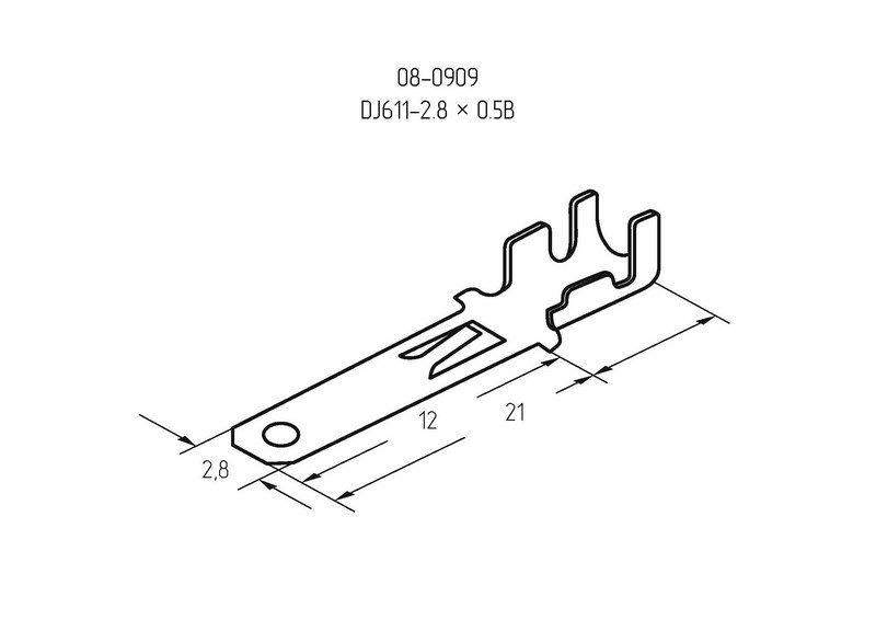 Клемма плоская (КП штекер - 2.8 мм) 0,5-1.5 мм2 (DJ611-2.8х0.5B) REXANT предназначена для создания качественного подключения электрооборудования или соединения проводов между собой, которое при необходимости возможно разъединить без лишних усилий. Такая клемма используется для оконцовывания многожильных медных проводов при монтаже мобильных электрических контактных соединений на подвижном составе (автомобиле-, вагоно-, самолето- и судостроении). Клемма плоская неизолированная (штекер) REXANT изготовлена из латуни. Обжатие производится специальными пресс-клещами (к примеру, ht-202 арт.12-3031 и 12-3032; ht-230 арт.12-3101 и 12-3001; ht-301 арт.12-3020) по жиле и по изоляции, что обеспечит максимальную прочность соединения с проводом. Размер контакта определяется шириной клеммы. Каждая клемма имеет отверстие, служащее фиксатором замкового типа с гнездовым разъемом. Основные характеристики: Температурный диапазон эксплуатации: -55...+135 ? Сечение применяемых проводов в диапазоне: 0,75-1.5 мм2 Рабочая ширина штекера: B = 2.8 мм Максимальное напряжение: 400 В. Применение плоских клемм дает возможность существенно ускорять электромонтажные работы, при этом появляется возможность неоднократного отсоединения и присоединения проводов. Рекомендовано использовать в зонах вибрации и повышенных температур.