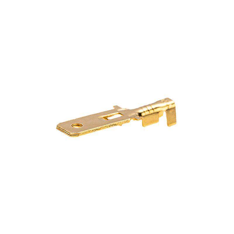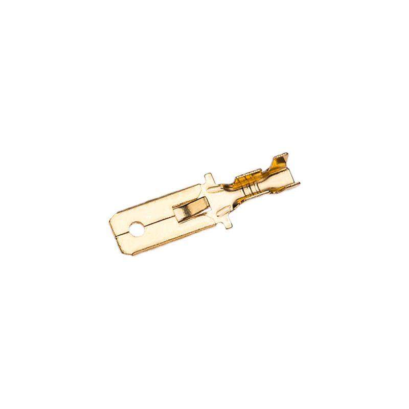 Клемма плоская (КП штекер – 6.3 мм) 0,5-1.5 мм2 (DJ611-6.3B) REXANT предназначена для создания качественного подключения электрооборудования или соединения проводов между собой, которое при необходимости возможно разъединить без лишних усилий. Такая клемма используется для оконцовывания многожильных медных проводов при монтаже мобильных электрических контактных соединений на подвижном составе (автомобиле-, вагоно-, самолето- и судостроении). Клемма плоская неизолированная (штекер) REXANT изготовлена из латуни. Обжатие производится специальными пресс-клещами (к примеру, ht-202 арт.12-3031 и 12-3032; ht-230 арт.12-3101 и 12-3001; ht-301 арт.12-3020) по жиле и по изоляции, что обеспечит максимальную прочность соединения с проводом. Размер контакта определяется шириной клеммы. Каждая клемма имеет отверстие, служащее фиксатором замкового типа с гнездовым разъемом. Основные характеристики: Температура эксплуатации: -55...+135 ?. Номинальное поперечное сечение: 1,5 мм2 Номинальная присоединительная способность: 0,75-1,5 мм2; Общая длина штекера: L = 25,5 мм Рабочая ширина штекера: B = 6.3 мм Применение плоских клемм дает возможность существенно ускорять электромонтажные работы, при этом появляется возможность неоднократного отсоединения и присоединения проводов. Рекомендовано использовать в зонах вибрации и повышенных температур.
