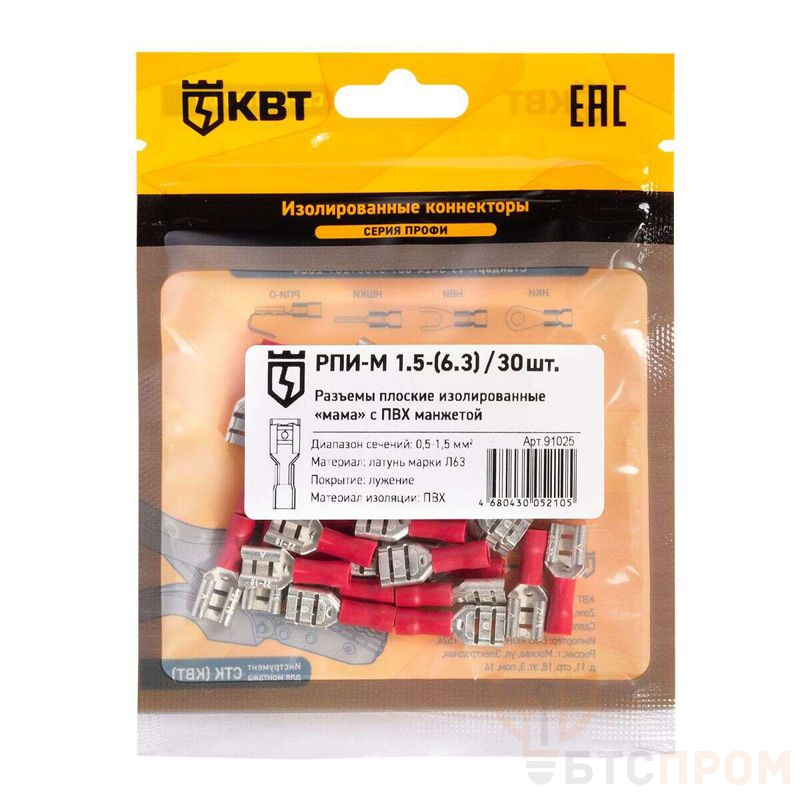 Разъем кабельный плоский изолированный мама РПИ-М 1.5-(6.3) (уп.30шт) КВТ 91025 фото в каталоге от BTSprom.by