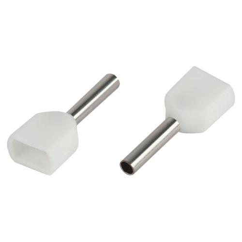 Наконечники-гильзы НШвИ(2) двойные состоят из медной луженой гильзы, один конец которой развальцован для облегчения ввода многожильного провода и изолирующей манжеты из полипропилена. Предназначены для использования с двумя проводниками: для оконцевания гибких многопроволочных медных проводников методом опрессовки для последующей фиксации в клемме или нулевой шине. Заменяют обязательный процесс облуживания многопроволочных медных проводов (типа ПВ-3, ПВС и т. п.). Применяются при сборке и монтаже электрощитового оборудования, щитов управления, квартирных или офисных распределительных щитков, при подключении к нулевым шинам. Наконечники-гильзы представлены в двух исполнениях для использования с одним и двумя проводниками. Особенности конструкции: Коническая форма внутренней части манжеты облегчает заведение гибкого многопроволочного проводника в наконечник, т.к. изготовлена по технологии «Easy-Entry»/«Быстрый ввод». Изолирующая манжета служит ограничителем и одновременно дополнительно фиксирует провод по изоляции, предотвращая его излом. Цветовая маркировка изолирующих манжет выполнена в соответствии с DIN 46228 часть 4, позволяет быстро подобрать нужный размер наконечника под сечение проводника. Материал гильзы: медь марки М1, покрытая электролитическим лужением. Материал манжеты: полипропилен с добавлением антипиренов, не поддерживающий горение.