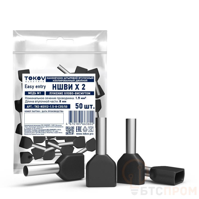 Наконечник штыревой втулочный изолированный двойной НШВИ(2) 1.5-8 от TOKOV ELECTRIC (артикул TKE-NSVI2-1.5-8-C05/50) предназначен для надежного и безопасного соединения двух медных проводников сечением 1.5 мм² в один контактный узел под винт диаметром 8 мм.