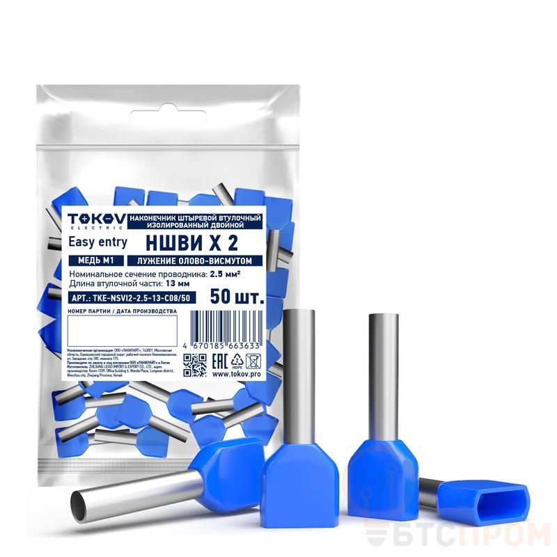 Наконечник штыревой втулочный изолированный двойн. НШВИ(2) 2.5-13 TOKOV ELECTRIC3 TKE-NSVI2-2.5-13-C08/50
