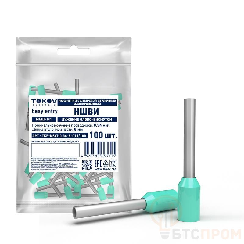 Наконечник штыревой втулочный изолированный НШВИ 0.34-8 от TOKOV ELECTRIC предназначен для надежного и безопасного соединения медных многопроволочных проводов сечением 0.34 мм² с винтовыми зажимами электрооборудования. Изделие имеет маркировку TKE-NSVI-0.34-8-C11/100.