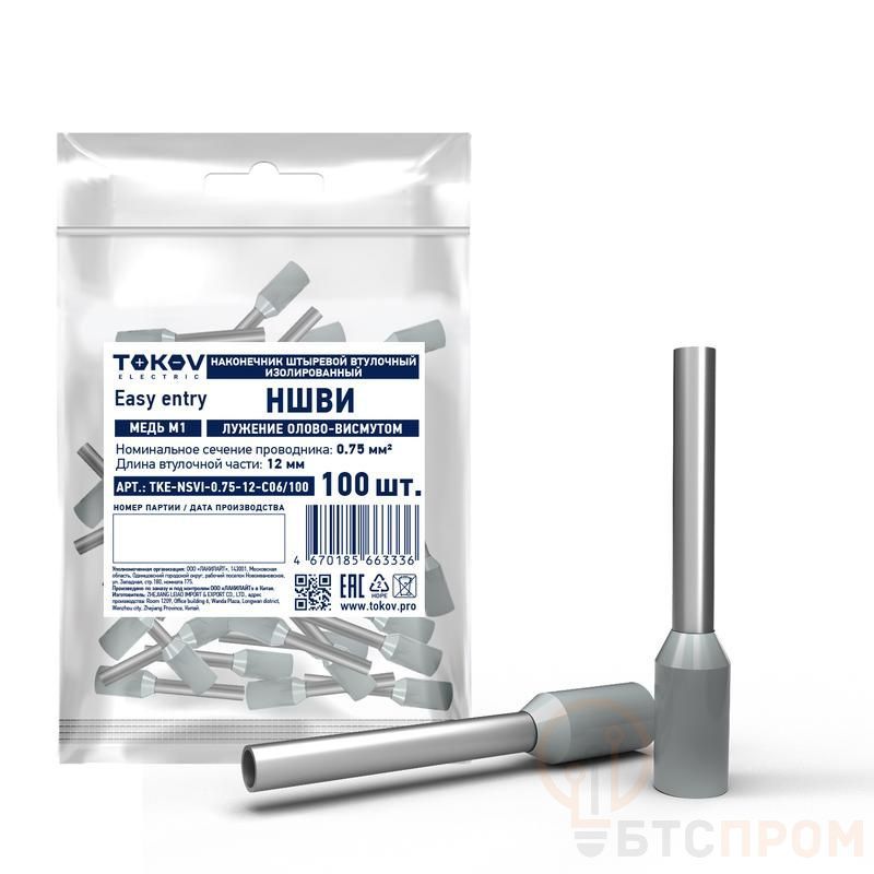 Наконечник штыревой втулочный изолированный НШВИ 0.75-12 TOKOV ELECTRIC TKE-NSVI-0.75-12-C06/100 фото в каталоге от BTSprom.by