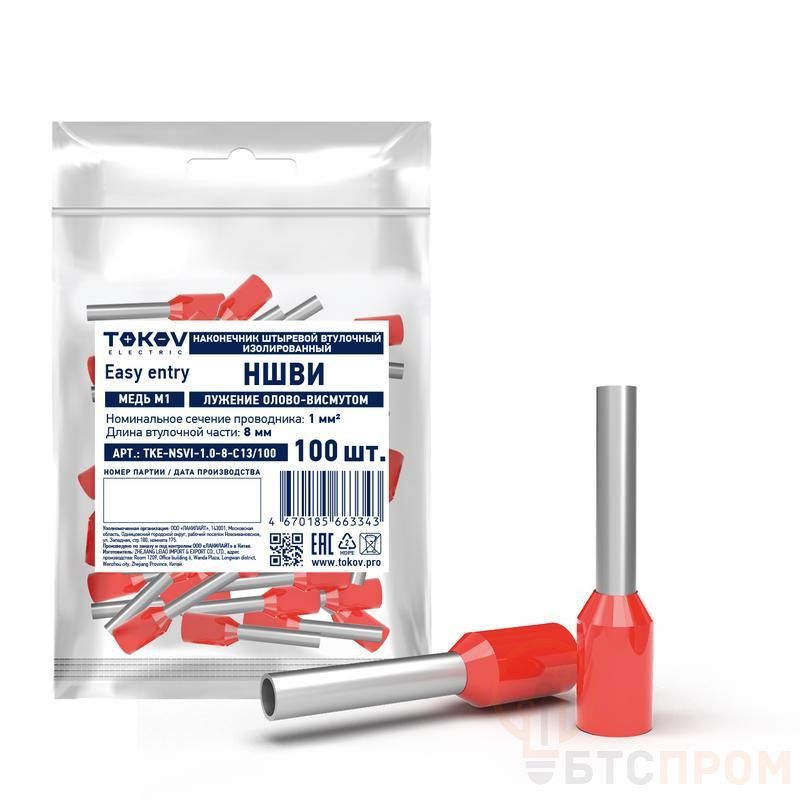 Наконечник штыревой втулочный изолированный НШВИ 1.0-8 от TOKOV ELECTRIC предназначен для надежного и безопасного соединения медных проводов сечением 1.0 мм² с винтовыми зажимами электротехнического оборудования под болт М8.