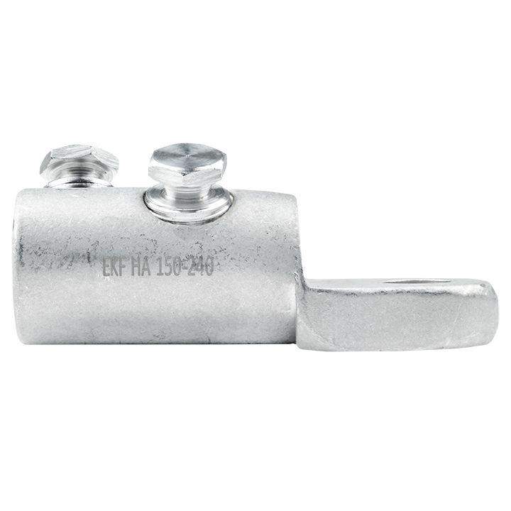 Болтовой наконечник типа НА предназначен для оконцевания предварительно зачищенных от изоляции жил проводов и кабелей, и подключения к клеммам электрооборудования. Подходит для подключения медных и алюминиевых проводов. Эксцентриковое отверстие цилиндрической части, на внутренней поверхности нанесена рифленая накатка и добавлена контактная смазка. Болты со срывной головкой, расположенные под углом друг к другу. При достижении момента, необходимого для создания надежного электрического контакта, происходит срыв головки болта ниже уровня плоскости поверхности наконечника. Наконечник устойчив к ультрафиолетовому и солнечному излучению, высоким и низким температурам, коррозии и агрессивным атмосферным воздействиям.