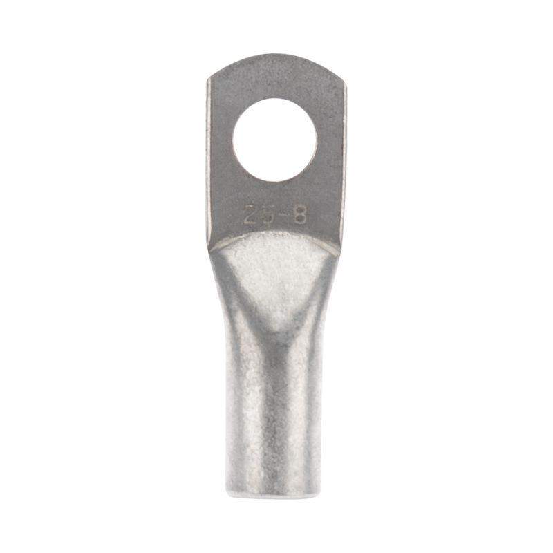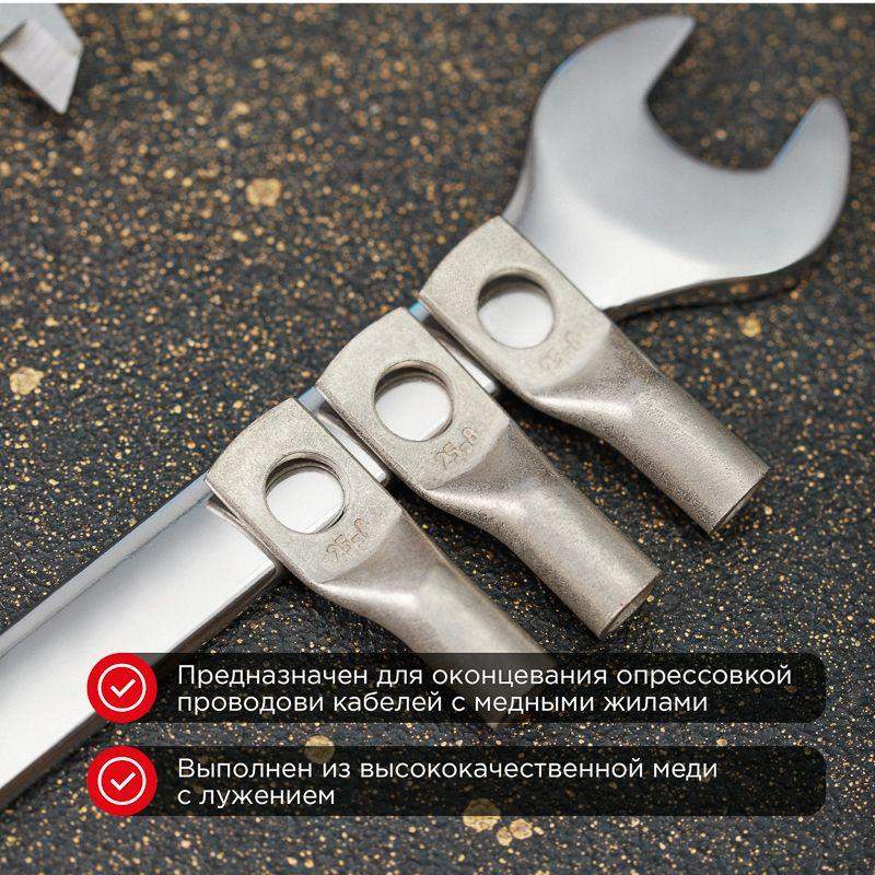 Наконечник ТМЛ-Р 25–8 (25мм2 - O8мм) REXANT предназначен для оконцевания проводов и кабелей с медными и алюминиевыми жилами посредством опрессовки для последующего болтового соединения проводника с оборудованием или шиной. Наконечник изготовлен из меди высокого качества, подвергнутой лужению, что улучшает электрический контакт, защищает изделие от окисления и коррозии, а также препятствует разрушению основного материала. Структура обозначения: Т — Труба — полуфабрикат, из которого изготовлен наконечник; М — Медь — материал, из которого изготовлен наконечник; Л — Луженый — покрытие; 25 — номинальное сечение, мм2; 8— диаметр контактного стержня (отверстие под болт) мм.
