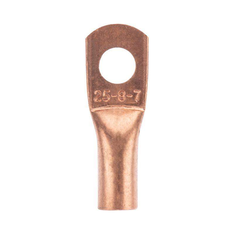 Наконечник ТМ 25-8-7 (25мм2 - O8мм) REXANT используется для оконцевания медных проводов и кабелей методом опрессовки для последующего соединения проводника с оборудованием или шиной, которое осуществляется с помощью болтов. Наконечник выполнен из высококачественной меди, благодаря чему обладает высокой электропроводностью, что обеспечивает стабильность работы и позволяет эффективно передавать электрический ток без потерь. Структура обозначения: Т — Труба — полуфабрикат, из которого изготовлен наконечник; М — Медь — материал, из которого изготовлен наконечник; 25 — номинальное сечение наконечника, мм2; 8 — диаметр контактного стержня, мм; 7— внутренний диаметр хвостовика, мм.