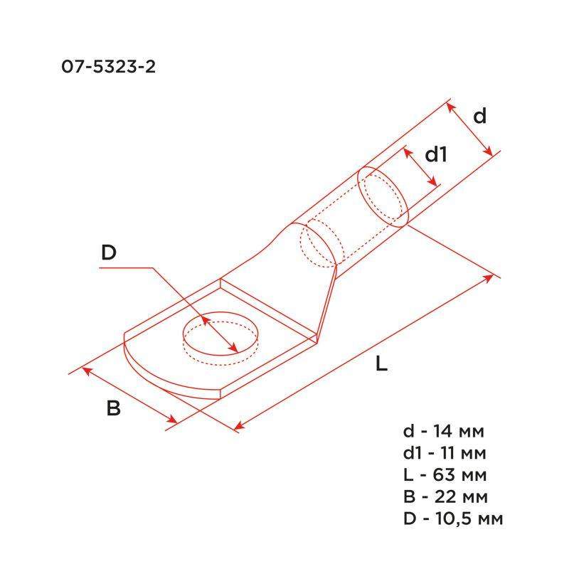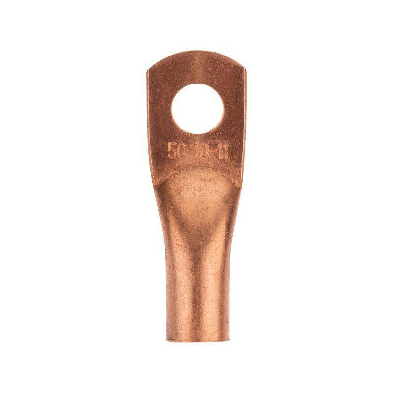 Наконечник ТМ 50-10-11 (50мм2 - O11мм) REXANT предназначен для оконцевания опрессовкой медных кабелей и проводов. Выполнен из высококачественной меди. Структура обозначения: Т — Труба — полуфабрикат, из которого изготовлен наконечник М — Медь — материал, из которого изготовлен наконечник 50— номинальное сечение наконечника, мм2 10 — диаметр контактного стержня, мм 11— внутренний диаметр хвостовика, мм