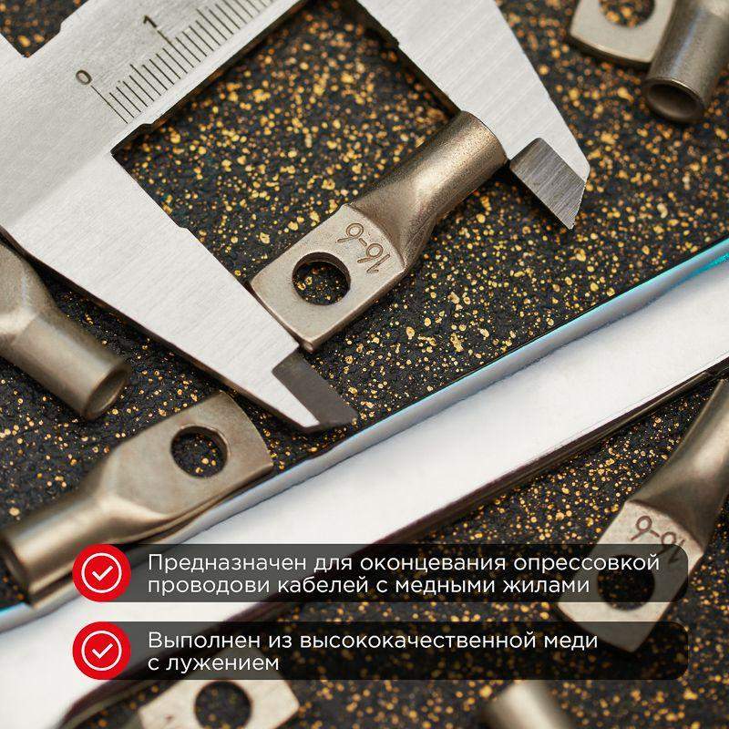 Наконечник предназначен для оконцевания проводов и кабелей с медными и жилами посредством опрессовки для последующего болтового соединения проводника с оборудованием или шиной. Изготавливается по ГОСТ 7386-80. Наконечник выполнен из электротехнической меди марки М2, подвергнутой электролитическому лужению, которое осуществляется путем нанесения слоя олова-висмута (Sn-Bi) на поверхность меди. Это гарантирует надежную защиту контактных соединений, препятствует разрушению основного материала, а также позволяет применять изделие в агрессивной среде. Структура обозначения: Т — Труба — полуфабрикат, из которого изготовлен наконечник; М — Медь — материал, из которого изготовлен наконечник; Л — Луженый — покрытие; 16 — номинальное сечение наконечника, мм2; 6 — диаметр контактного стержня, мм; 6 — внутренний диаметр хвостовика, мм.