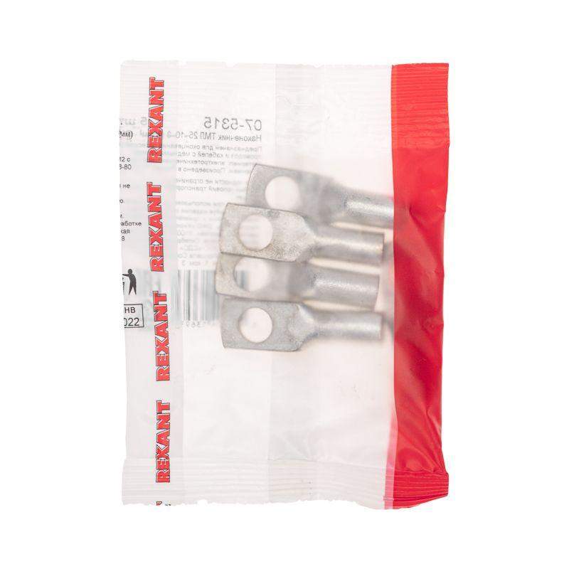 Наконечник предназначен для оконцевания проводов и кабелей с медными и жилами посредством опрессовки для последующего болтового соединения проводника с оборудованием или шиной. Изготавливается по ГОСТ 7386-80. Наконечник выполнен из электротехнической меди марки М2, подвергнутой электролитическому лужению, которое осуществляется путем нанесения слоя олова-висмута (Sn-Bi) на поверхность меди. Это гарантирует надежную защиту контактных соединений, препятствует разрушению основного материала, а также позволяет применять изделие в агрессивной среде. Структура обозначения: Т — Труба — полуфабрикат, из которого изготовлен наконечник; М — Медь — материал, из которого изготовлен наконечник; Л — Луженый — покрытие; 25 — номинальное сечение наконечника, мм2; 10 — диаметр контактного стержня, мм; 8 — внутренний диаметр хвостовика, мм.