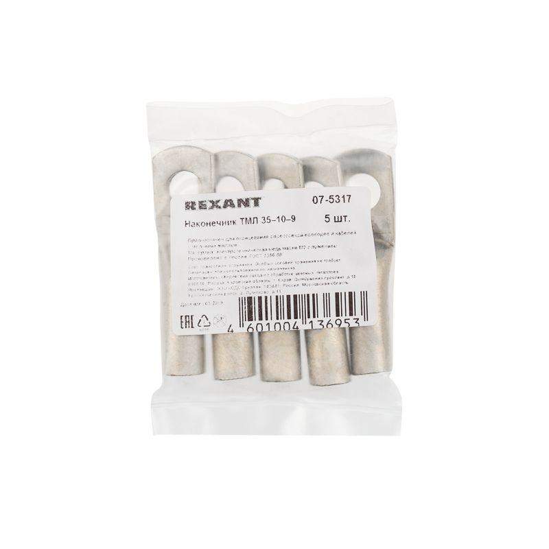 Наконечник предназначен для оконцевания проводов и кабелей с медными и жилами посредством опрессовки для последующего болтового соединения проводника с оборудованием или шиной. Изготавливается по ГОСТ 7386-80. Наконечник выполнен из электротехнической меди марки М2, подвергнутой электролитическому лужению, которое осуществляется путем нанесения слоя олова-висмута (Sn-Bi) на поверхность меди. Это гарантирует надежную защиту контактных соединений, препятствует разрушению основного материала, а также позволяет применять изделие в агрессивной среде. Структура обозначения: Т — Труба — полуфабрикат, из которого изготовлен наконечник; М — Медь — материал, из которого изготовлен наконечник; Л — Луженый — покрытие; 35 — номинальное сечение наконечника, мм2; 10 — диаметр контактного стержня, мм; 9 — внутренний диаметр хвостовика, мм.