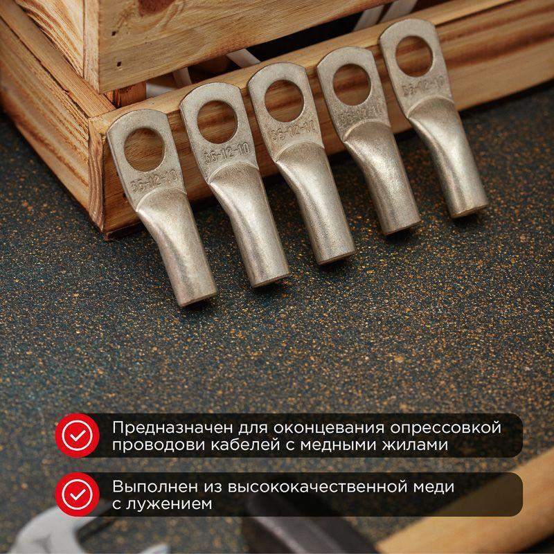 Наконечник предназначен для оконцевания проводов и кабелей с медными и жилами посредством опрессовки для последующего болтового соединения проводника с оборудованием или шиной. Изготавливается по ГОСТ 7386-80. Наконечник выполнен из электротехнической меди марки М2, подвергнутой электролитическому лужению, которое осуществляется путем нанесения слоя олова-висмута (Sn-Bi) на поверхность меди. Это гарантирует надежную защиту контактных соединений, препятствует разрушению основного материала, а также позволяет применять изделие в агрессивной среде. Структура обозначения: Т — Труба — полуфабрикат, из которого изготовлен наконечник; М — Медь — материал, из которого изготовлен наконечник; Л — Луженый — покрытие; 35 — номинальное сечение наконечника, мм2; 12 — диаметр контактного стержня, мм; 10 — внутренний диаметр хвостовика, мм.