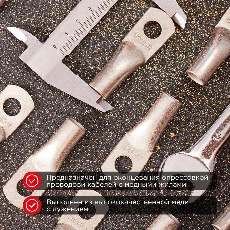 Наконечник ТМЛ 50–10–11 (50мм2 - O10мм) REXANT предназначен для оконцевания проводов и кабелей с медными и алюминиевыми жилами посредством опрессовки для последующего болтового соединения проводника с оборудованием или шиной. Наконечник изготовлен из меди высокого качества, подвергнутой лужению, что улучшает электрический контакт, защищает изделие от окисления и коррозии, а также препятствует разрушению основного материала. Структура обозначения: Т — Труба — полуфабрикат, из которого изготовлен наконечник; М — Медь — материал, из которого изготовлен наконечник; Л — Луженый — покрытие; 50 — номинальное сечение наконечника, мм2; 10 — диаметр контактного стержня, мм; 11 — внутренний диаметр хвостовика, мм.