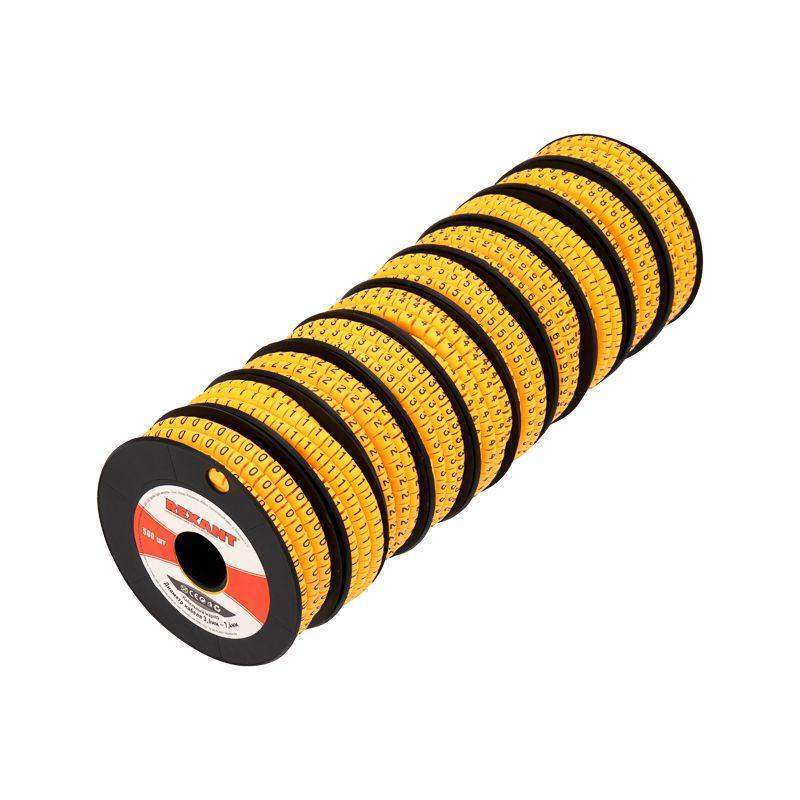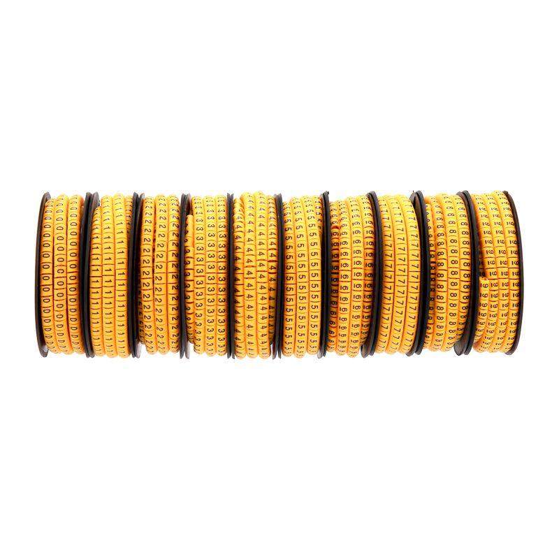 Маркеры с цифрами от 0 до 9 предназначены для маркировки проводов и кабелей в распределительных щитах. Облегчают идентификацию проводов в процессе монтажа и демонтажа проводки. Рабочая температура не должна превышать 85°C. Благодаря специальной эластичной форме каждый маркер надежно фиксируется на проводах с сечением от 3,6 до 7,4 мм. Предусмотрено отверстие для проводника. Материал изготовления – эластичный и негорючий поливинилхлорид. Комплект состоит из 10 роликов. На одном ролике расположено 500 цифр.