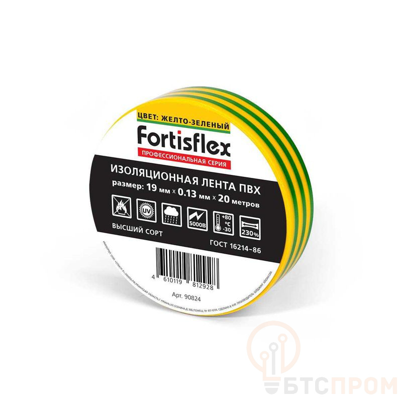 Изолента ПВХ 19х0.13х20 желт./зел. Fortisflex 90824 фото в каталоге от BTSprom.by