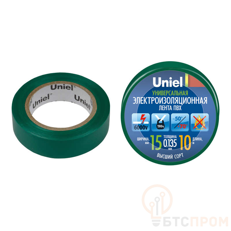 Лента изоляционная 0.135х15мм 10м UIT-135P 10/15/01 GRN зел. Uniel 04512 фото в каталоге от BTSprom.by