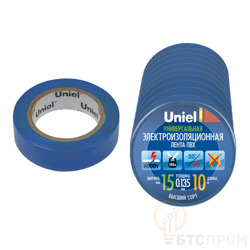 Лента изоляционная 0.135х15мм 10м UIT-135P 10/15/10 BLU син. (уп.10шт) Uniel 04518 фото в каталоге от BTSprom.by