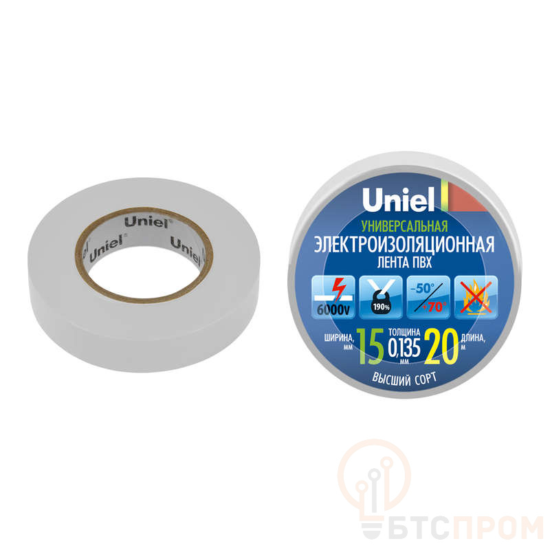 Лента изоляционная 0.135х15мм 20м UIT-135P 20/15/01 WHT бел. Uniel 04488 фото в каталоге от BTSprom.by