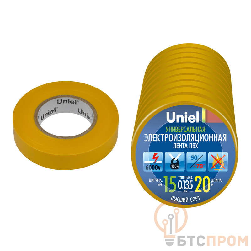 Лента изоляционная 0.135х15мм 20м UIT-135P 20/15/10 YEL желт. (уп.10шт) Uniel 04506 фото в каталоге от BTSprom.by