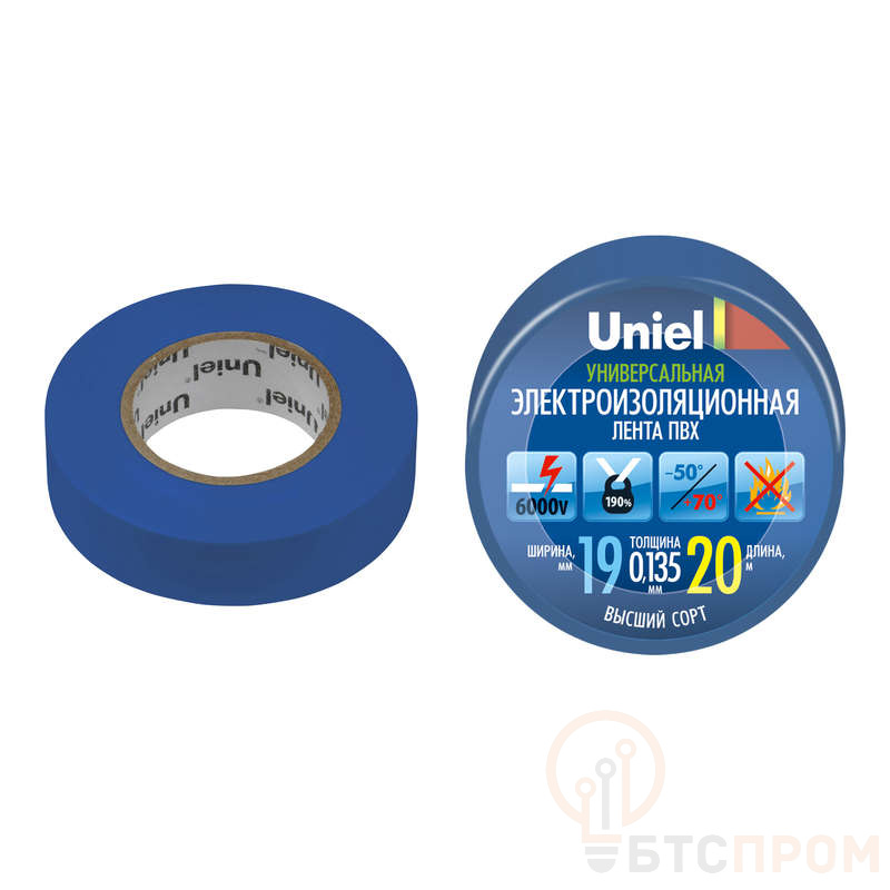 Лента изоляционная 0.135х19мм 20м UIT-135P 20/19/01 BLU син. Uniel 04477 фото в каталоге от BTSprom.by