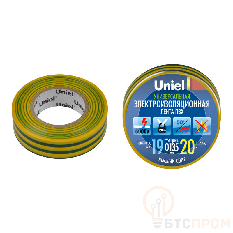 Лента изоляционная 0.135х19мм 20м UIT-135P 20/19/01 YGR желт./зел. Uniel 04483 фото в каталоге от BTSprom.by