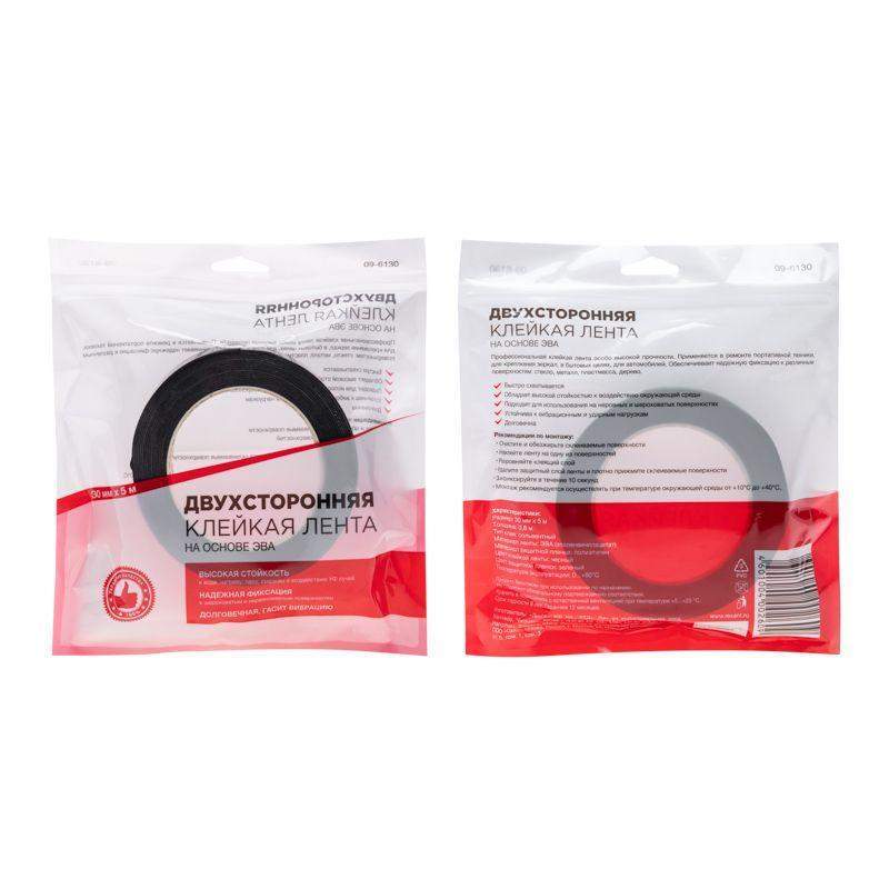 Двухстороння клейкая лента на основе ЭВА (вспененного полиэтилена) применяется для склеивания различных по структуре поверхностей: благодаря вспененной основе лента повторяет форму рельефа и заполняет его неровности. Полиэтиленовая лента отличается высокой адгезией, поэтому хорошо фиксирует материалы на длительный срок. Максимальная величина адгезии достигается через сутки после склеивания предметов. Устойчива к ультрафиолетовому излучению, маслам, пластификаторам и растворителям. Обладает хорошей прочностью на разрыв и растяжение.