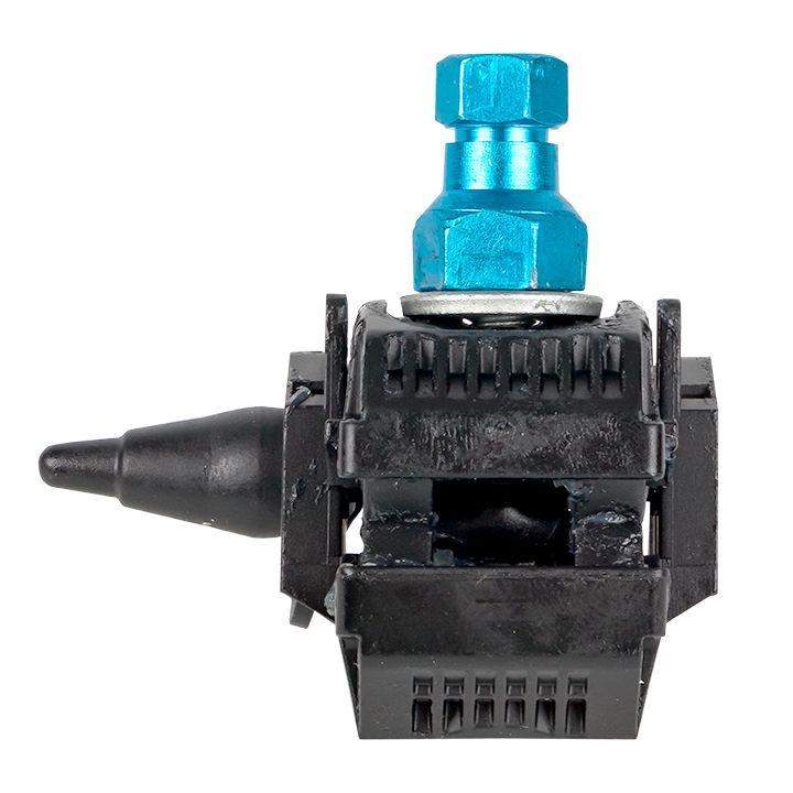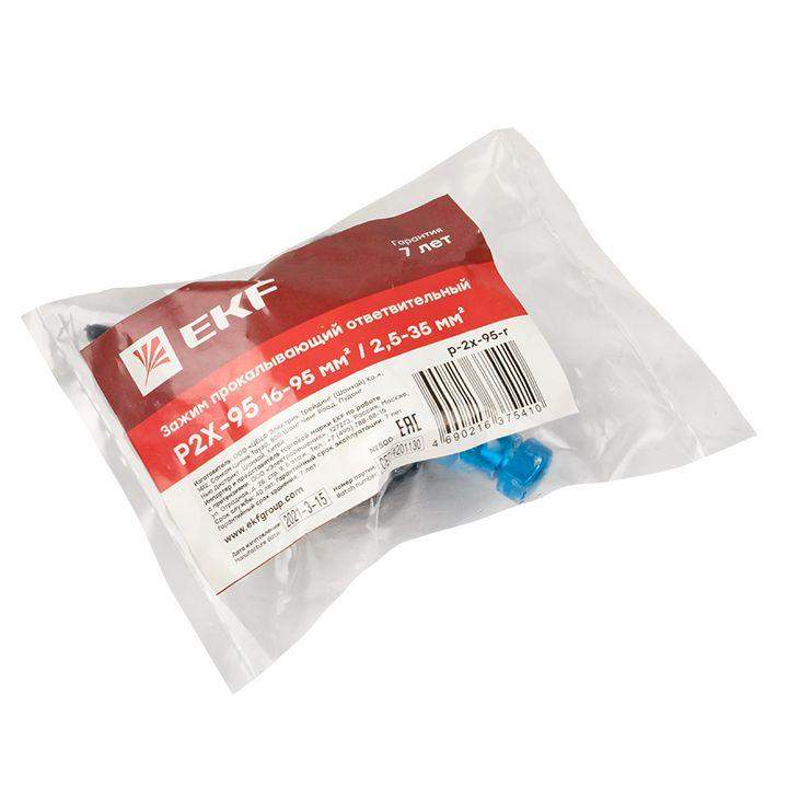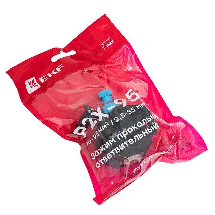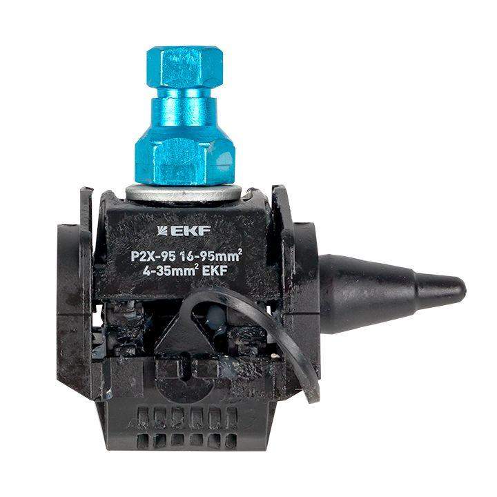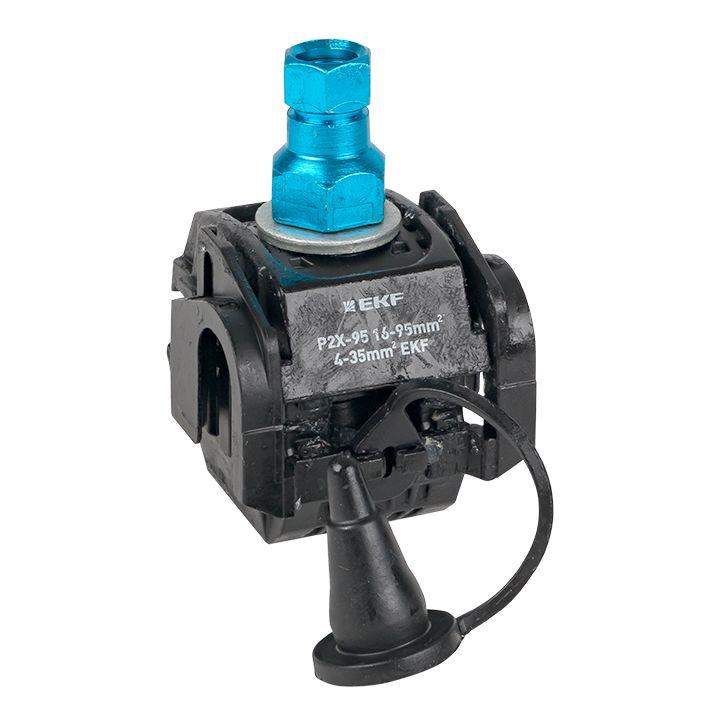 Зажим типа p-2x-95 предназначен для герметичного электрического соединения ответвительной линии СИП с магистралью. Контакт с изолированным проводом обеспечивается прокалыванием изоляции. При достижении момента, необходимого для создания надежного электрического контакта проводов, происходит срыв головки болта. Контактные пластины изготовлены из алюминиевого сплава. На прокалывающие элементы нанесена контактная смазка. Болт изолирован от контактных деталей зажима. Зажим устойчив к ультрафиолетовому и солнечному излучению, высоким и низким температурам, коррозии и агрессивным атмосферным воздействиям.