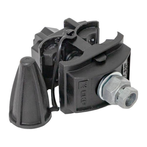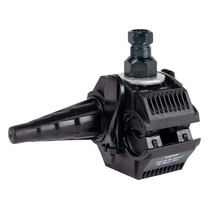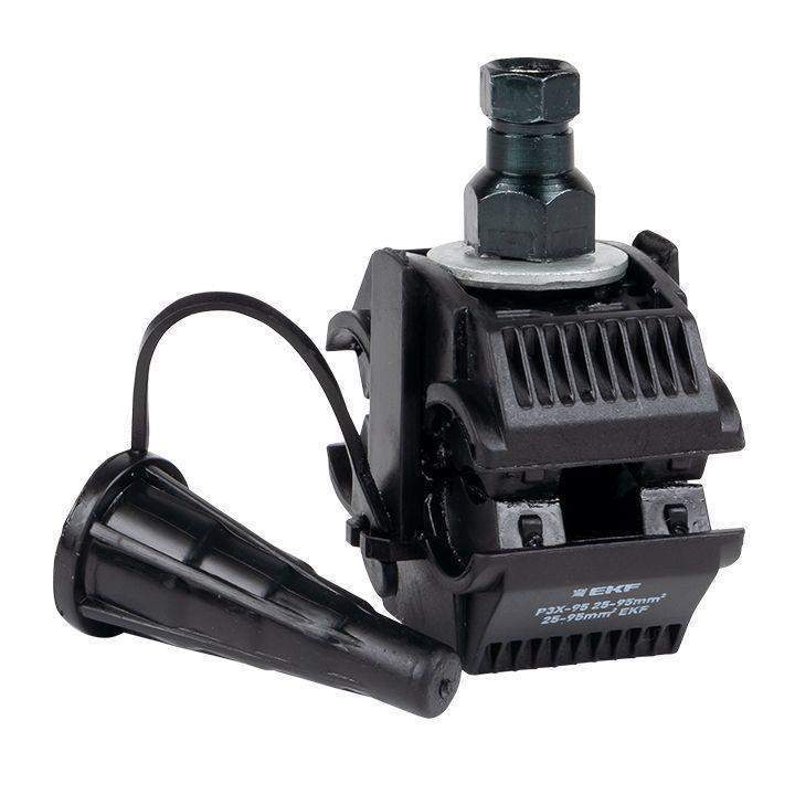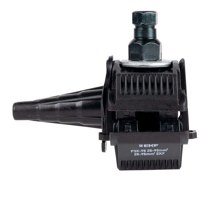 Зажим типа p-3x-95 предназначен для герметичного электрического соединения ответвительной линии СИП с магистралью. Контакт с изолированным проводом обеспечивается прокалыванием изоляции. При достижении момента, необходимого для создания надежного электрического контакта проводов, происходит срыв головки болта. Контактные пластины изготовлены из алюминиевого сплава. На прокалывающие элементы нанесена контактная смазка. Болт изолирован от контактных деталей зажима. Зажим устойчив к ультрафиолетовому и солнечному излучению, высоким и низким температурам, коррозии и агрессивным атмосферным воздействиям.