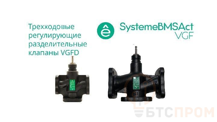 Клапан регулирующий седельный 3-ходовой разделительный с фланцевым присоединением, класс давления PN16, диаметр DN65, пропускная способность 49м?/ч, температура теплоносителя -20…+130°С