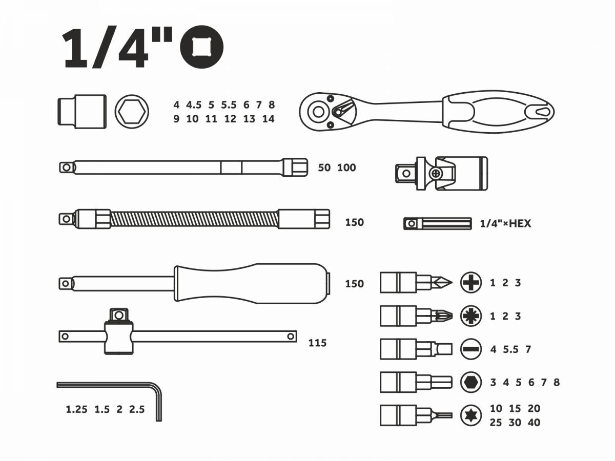 Назначение: многофункциональный набор предназначен для ремонта и обслуживания автомобиля, а также для выполнения других слесарных работ;