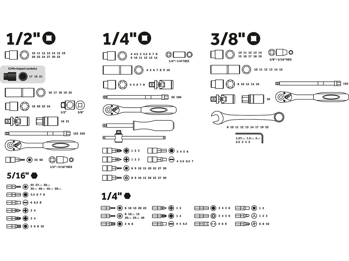 Материал: рабочие части изготовлены из хромованадиевой стали, устойчивы к коррозии, ударные головки 12 17,19,21 мм изготовлены из хромомолибденовой стали;
