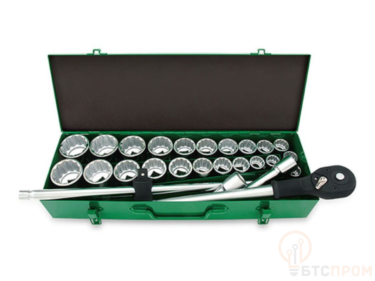 Кейс изготовлен из металла и закрывается с помощью двух металлических замков. Разделен на два отсека, в одном расположены головки, а во втором свободно расположен остальной инструмент, это обеспечивает удобное хранение набора.